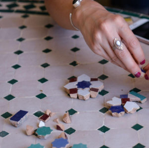 The workshop revolves around mosaics, or “zelige”, which is featured in riads and traditional Moroccan homes. The workshop teaches you about the art of mosaic making, the different shapes and forms, and the raw materials involved, as well as the process of making and assembling the mosaics. You’ll both observe and get to try your hand at making parts of a mosaic tile, with your very own tile to take home afterwards